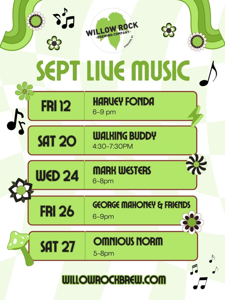 Get ready, Cicero! September is packed with great tunes and good brews at Willow Rock Brewing Company. Our Live Music Calendar is set, and we’re bringing you a full lineup